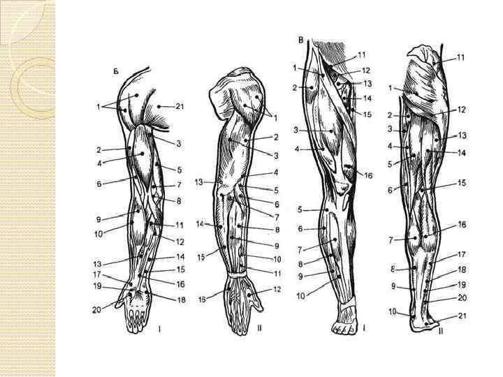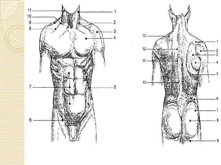 Двигательные точки Эрба (передняя поверхность туловища): 1 — Грудино-ключично-сосцевидная мышца; 2 — Лопаточно-подъязычная мышца; 3 — Дельтовидная мышца; 4 — Большая грудная мышца (грудинореберная часть); 5 — Наружная косая мышца живота; 6 — бедренный нерв; 7 — Прямая мышца живота; 8 — Большая грудная мышца (ключичная часть); 9 — Трапециевидная мышца; 10 — плечевое сплетение; 11 — подкожная мышца шеи. Рис. Двигательные точки Эрба (задняя поверхность туловища): 1 — Надостная мышца; 2 — Дельтовидная мышца; 3 — Подостная мышца; 4 — Ромбовидная мышца; 5 — Широчайшая мышца спины; 6 — Наружная косая мышца живота; 7 — Средняя ягодичная мышца; 8— Большая ягодичная мышца; 9 — Седалищный нерв; 10 — Широчайшая мышца спины; 11 — Трапециевидная мышца; 12 — малая ромбовидная мышца; 13 — Трапециевидная мышца.
