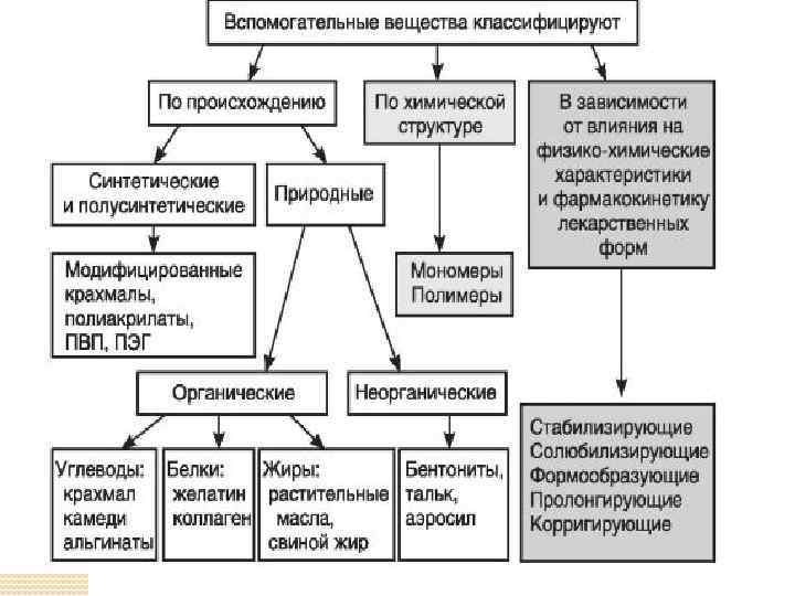 Классификация вспомогательных веществ По ряду причин: разнообразие химической природы, влияние на лекарственные формы (стабильность, пролонгирование, исправление вкуса и т. д. ) и их терапевтическую эффективность, предлагаемая классификация не может считаться совершенной, хотя является достаточно удобной. В основе классификации вспомогательных веществ лежит ряд признаков: природа, влияние на технологические характеристики и фармакокинетику лекарственных форм.