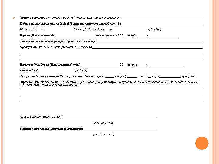 Шыққан, ауыстырылған кездегі жағдайы (Состояние при выписке, переводе) ___________________________ Еңбекке жарамсыздық парағы берілді (Выдан листок нетрудоспособности) № ___________________________ 20__ж. (г. ) «____» __________ бастап (с) 20__ ж. (г. ) «____» ____________ дейін (по) Нәресте (Новорожденный) ______________шықты (выписан) 20___ж. (г. ) «______» __________ Қайда және қашан ауыстырылды (Переведен куда и когда)___________________________________ Аустырылған кездегі диагнозы (Диагноз при переводе)____________________________________________________________________________________ Нәресте қайтыс болды (Новорожденный умер) _____________ 20___ж. (г. ) «______» ____________ жынысы (пол) күні (дата) Өлі туылды (астын сызыңыз) (Мертворожденный (подчеркнуть)) ______ сағ. (час) _______ мин. 20__ж. (г. ) _______ күні (дата) Нәрестенің қайтыс болған кезінде немесе өлі туған кезде (В случае смерти новорожденного или мертворождения): Патологоанатомиялық диагнозы (Диагноз патолого-анатомический): ________________________________________________________________________________________________________________________ Емдеуші дәрігер (Лечащий врач) _______________________________ қолы (подпись) Бөлімше меңгерушісі (Заведующий отделением) ________________________ қолы (подпись)