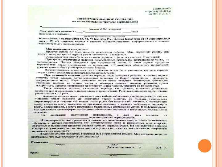 Бала жолдасының түсуі: өз еркімен, бөлінді, қолмен алынды, әдіс қолданылды (Послед. выделился: самостоятельно, отделен, удален рукою, применен прием) _____________________ арқылы/через________ сағ/час _____ мин Осы жүктіліктің ағымы мен асқынулары ( Течение и осложнения настоящей беременности) _______________________________ Бала орны бүтін, күмәнді (Детское место целое, под сомнением) _____________________________________________________________ Барлық қабықтары түгел, күмәнді (Оболочки все, под сомнением)_____________ Бала жолдасының макроскопиясы (Макроскопия последа) ______________________ Кіндік: ұзындығы (Пуповина): длина _____________ см. оралуы/обвитие вокруг___________________ ерекшеліктері/особенности __________________ Босану кезіндегі қансырау (Кровопотеря в родах) ______мл Психопрофилак. дайындық. қандай дәрімен жансыздандырылды: немен (Психопрофилакт. подготовка, медикамент. обезболивание: чем) _______________________________ __әсері толық, аздаған, әсері жоқ (астын сызыңыз) (эффект полный, частичный, без эффекта (подчеркнуть)). Түскен кездегі жағдайы, сыртқы қарау деректері (Состояние при поступлении, данные наружного осмотра): _____________________________________________________________ Жүрек (Сердце) _____________________________________________________________ Тамыр соғуы (Пульс)_____________________ Оң қолда АҚҚ (АД на правой руке) _______________ Сол қолда (на левой)______________________ Тыныс алу ағзалары (Органы дыхания) ____________________________________________ Ас қорыту ағзалары (Органы пищеварения)____________ Босану ұзақтығы (Продолжительность родов) Несеп- жыныстық жүйесі (Мочеполовая система)__________ Жалпы (Общая) ______ I кезең(пер). _______ II кезең (пер). _________ III кезең( пер. ) ________________________________________ Баланы қабылдаған (акушерка, дәрігер) (Приняла ребенка (акушерка, врач))_______________________________ Бала жолдасын қараған (Послед осматривал)_________ Несеп қайнаткан кезде (Моча при кипячении) _________________________________________ Кезекші дәрігер (Деж. врач)________________ Қолы (Подпись)________________________ Акушер (Акушерка)____________________