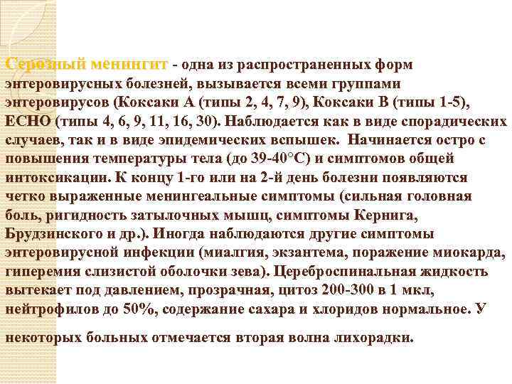 Серозный менингит - одна из распространенных форм энтеровирусных болезней, вызывается всеми группами энтеровирусов (Коксаки А (типы 2, 4, 7, 9), Коксаки В (типы 1 -5), ECHO (типы 4, 6, 9, 11, 16, 30). Наблюдается как в виде спорадических случаев, так и в виде эпидемических вспышек. Начинается остро с повышения температуры тела (до 39 -40°С) и симптомов общей интоксикации. К концу 1 -го или на 2 -й день болезни появляются четко выраженные менингеальные симптомы (сильная головная боль, ригидность затылочных мышц, симптомы Кернига, Брудзинского и др. ). Иногда наблюдаются другие симптомы энтеровирусной инфекции (миалгия, экзантема, поражение миокарда, гиперемия слизистой оболочки зева). Цереброспинальная жидкость вытекает под давлением, прозрачная, цитоз 200 -300 в 1 мкл, нейтрофилов до 50%, содержание сахара и хлоридов нормальное. У некоторых больных отмечается вторая волна лихорадки.