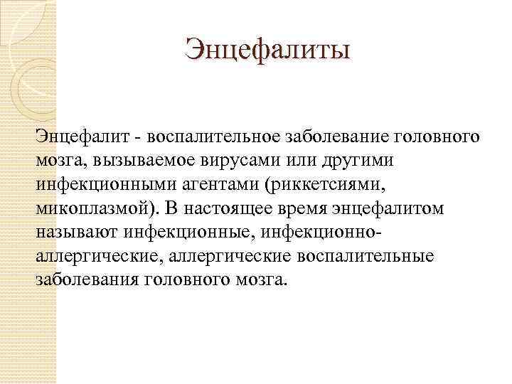 Энцефалиты Энцефалит - воспалительное заболевание головного мозга, вызываемое вирусами или другими инфекционными агентами (риккетсиями, микоплазмой). В настоящее время энцефалитом называют инфекционные, инфекционноаллергические, аллергические воспалительные заболевания головного мозга.