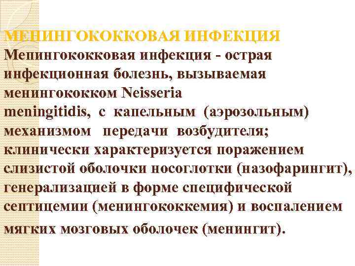 МЕНИНГОКОККОВАЯ ИНФЕКЦИЯ Мепингококковая инфекция - острая инфекционная болезнь, вызываемая менингококком Neisseria meningitidis, с капельным (аэрозольным) механизмом передачи возбудителя; клинически характеризуется поражением слизистой оболочки носоглотки (назофарингит), генерализацией в форме специфической септицемии (менингококкемия) и воспалением мягких мозговых оболочек (менингит).