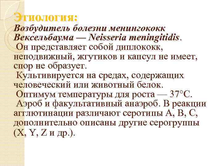 Этиология: Возбудитель болезни менингококк Вексельбаума — Neisseria meningitidis. Он представляет собой диплококк, неподвижный, жгутиков и капсул не имеет, спор не образует. Культивируется на средах, содержащих человеческий или животный белок. Оптимум температуры для роста — 37°С. Аэроб и факультативный анаэроб. В реакции агглютинации различают серотипы А, В, С, дополнительно описаны другие серогруппы (X, Y, Z и др. ).