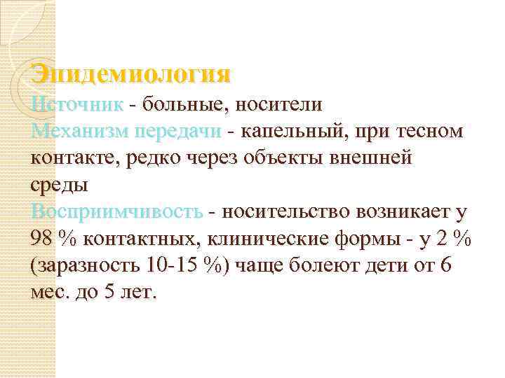 Эпидемиология Источник - больные, носители Механизм передачи - капельный, при тесном контакте, редко через объекты внешней среды Восприимчивость - носительство возникает у 98 % контактных, клинические формы - у 2 % (заразность 10 -15 %) чаще болеют дети от 6 мес. до 5 лет.