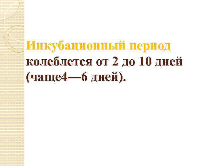 Инкубационный период колеблется от 2 до 10 дней (чаще 4— 6 дней).