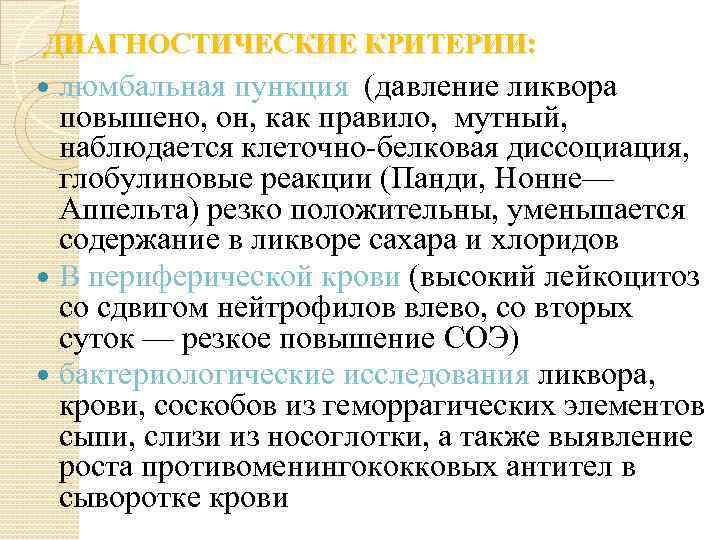 ДИАГНОСТИЧЕСКИЕ КРИТЕРИИ: люмбальная пункция (давление ликвора повышено, он, как правило, мутный, наблюдается клеточно-белковая диссоциация, глобулиновые реакции (Панди, Нонне— Аппельта) резко положительны, уменьшается содержание в ликворе сахара и хлоридов В периферической крови (высокий лейкоцитоз со сдвигом нейтрофилов влево, со вторых суток — резкое повышение СОЭ) бактериологические исследования ликвора, крови, соскобов из геморрагических элементов сыпи, слизи из носоглотки, а также выявление роста противоменингококковых антител в сыворотке крови