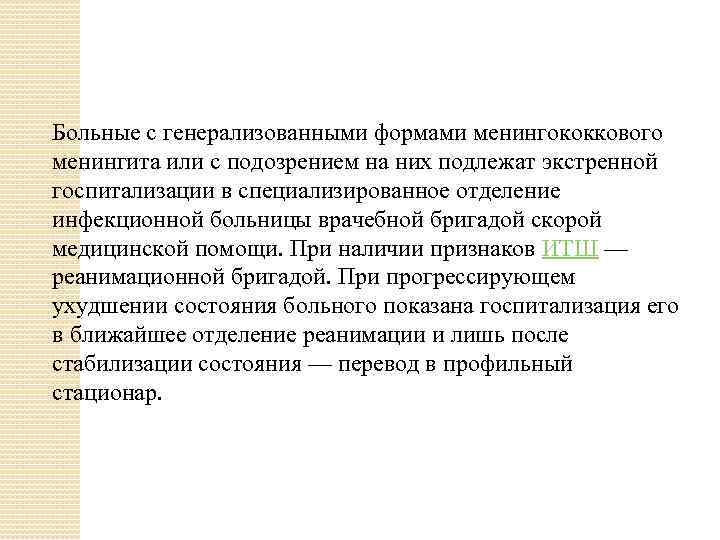 Больные с генерализованными формами менингококкового менингита или с подозрением на них подлежат экстренной госпитализации в специализированное отделение инфекционной больницы врачебной бригадой скорой медицинской помощи. При наличии признаков ИТШ — реанимационной бригадой. При прогрессирующем ухудшении состояния больного показана госпитализация его в ближайшее отделение реанимации и лишь после стабилизации состояния — перевод в профильный стационар.