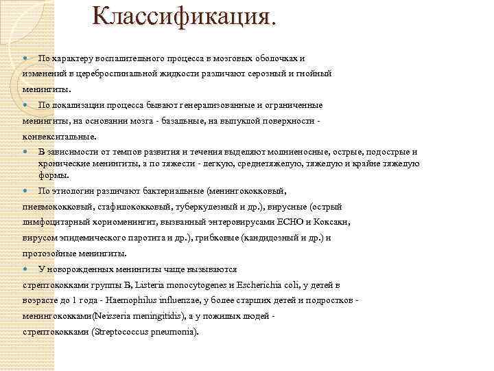 Классификация. По характеру воспалительного процесса в мозговых оболочках и изменений в цереброспинальной жидкости различают серозный и гнойный менингиты. По локализации процесса бывают генерализованные и ограниченные менингиты, на основании мозга - базальные, на выпуклой поверхности - конвекситальные. В зависимости от темпов развития и течения выделяют молниеносные, острые, подострые и хронические менингиты, а по тяжести - легкую, среднетяжелую, тяжелую и крайне тяжелую формы. По этиологии различают бактериальные (менингококковый, пневмококковый, стафилококковый, туберкулезный и др. ), вирусные (острый лимфоцитарный хориоменингит, вызванный энтеровирусами ECHO и Коксаки, вирусом эпидемического паротита и др. ), грибковые (кандидозный и др. ) и протозойные менингиты. У новорожденных менингиты чаще вызываются стрептококками группы В, Listeria monocytogenes и Escherichia coli, у детей в возрасте до 1 года - Haemophilus influenzae, у более старших детей и подростков - менингококками(Neisseria meningitidis), а у пожилых людей - стрептококками (Streptococcus pneumonia).