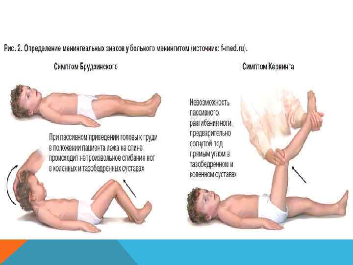 Для менингеального симптома общая гиперестезия, менингеальная поза, ригидность шейных мышц, симптомы Кернинга, Брудзинского, скуловой симптом Бехтерева и др.