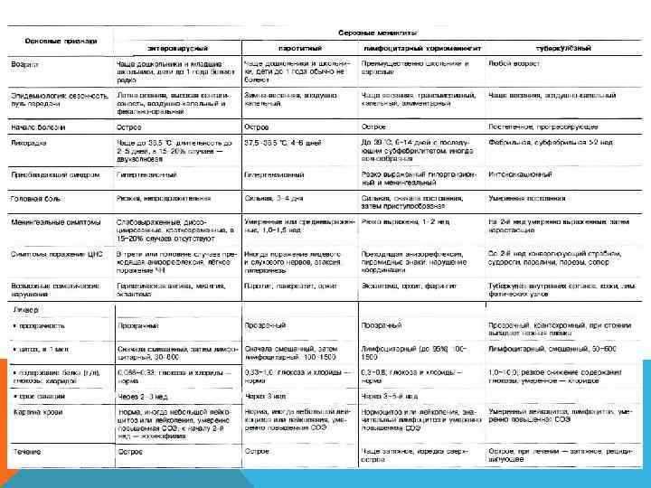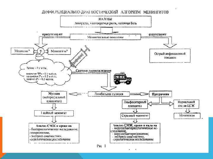 Менингита устанавливается при наличии одновременно трех синдромов: 1) общеинфекционного; 2) оболочечного (менингеального); 3) изменений в цереброспинальной жидкости, характерных для воспаления. !!!Наличие одного из них еще не дает оснований диагностировать менингит. Так, как оболочечные симптомы могут быть обусловлены раздражением оболочек (менингизм). Увеличение количества клеток в цереброспинальной жидкости может быть связано с реакцией оболочек на опухоль или излившуюся кровь. Диагноз уточняется на основании исследования цереброспинальной жидкости и применения бактериологических, вирусологических и других методов диагностики инфекционных заболеваний с учетом эпидемиологической обстановки и