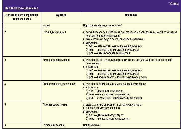 l В 1882 г. W. Erb предложил определять тяжесть поражения лицевого нерва по результатам электрофизиологического исследования. Так, различают легкое поражение без изменений электровозбудимости лицевых мышц (длительность болезни не превышает 2– 3 недели), среднее — с частичной реакцией перерождения (выздоровление наступает через 4– 7 недель) и тяжелое — с полной реакцией перерождения (выздоровление (неполное) наступает через много месяцев).