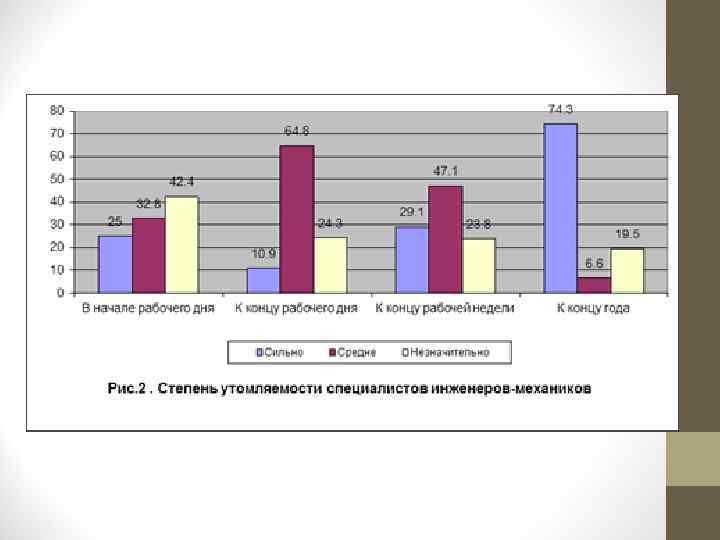 Профилактика переутомления 1. Технологические меры - создание наиболее благоприятных технологических условий для уменьшения утомляемости (механизация, автоматизация, улучшение технических характеристик аппаратуры, инструментов и т. д. ) 2. Рационализация трудового процесса (экономичность, ритмичность, перерывы, отдых и т. д. ). Режим работы играет важную роль и определяется тяжестью работы: чем тяжелее работа, тем перерывы чаще и короче. В течение рабочего дня необходим большой перерыв (обеденный). Хороший эффект дает также производственная гимнастика. 3. Рационализация санитарно-гигиенических условий. 4. Повышение квалификации (тренированности) работников. Высококвалифицированные рабочие обычно утомляются позже.