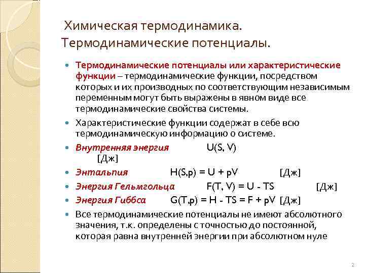 Химическая термодинамика. Термодинамические потенциалы или характеристические функции – термодинамические функции, посредством которых и их производных по соответствующим независимым переменным могут быть выражены в явном виде все термодинамические свойства системы. Характеристические функции содержат в себе всю термодинамическую информацию о системе. Внутренняя энергия U(S, V) [Дж] Энтальпия H(S, p) = U + p. V [Дж] Энергия Гельмгольца F(T, V) = U - TS [Дж] Энергия Гиббса G(T, p) = H - TS = F + p. V [Дж] Все термодинамические потенциалы не имеют абсолютного значения, т. к. определены с точностью до постоянной, которая равна внутренней энергии при абсолютном нуле 2