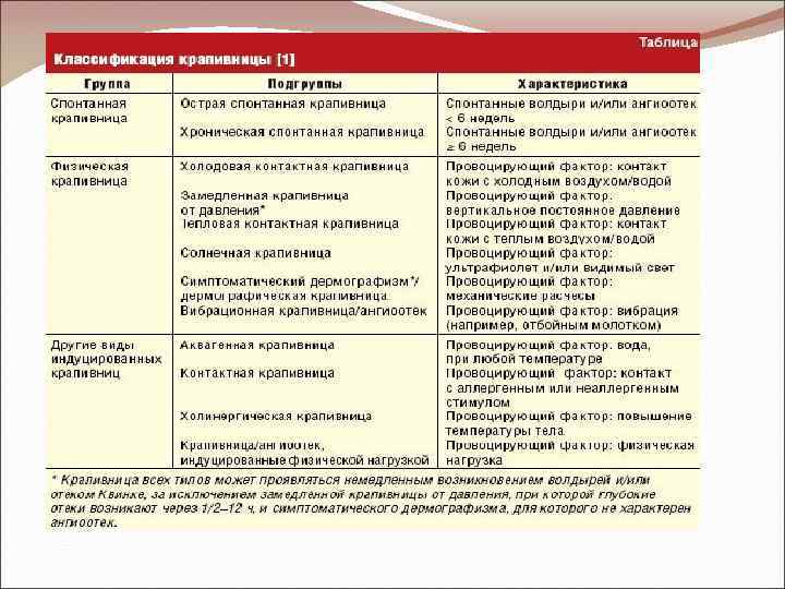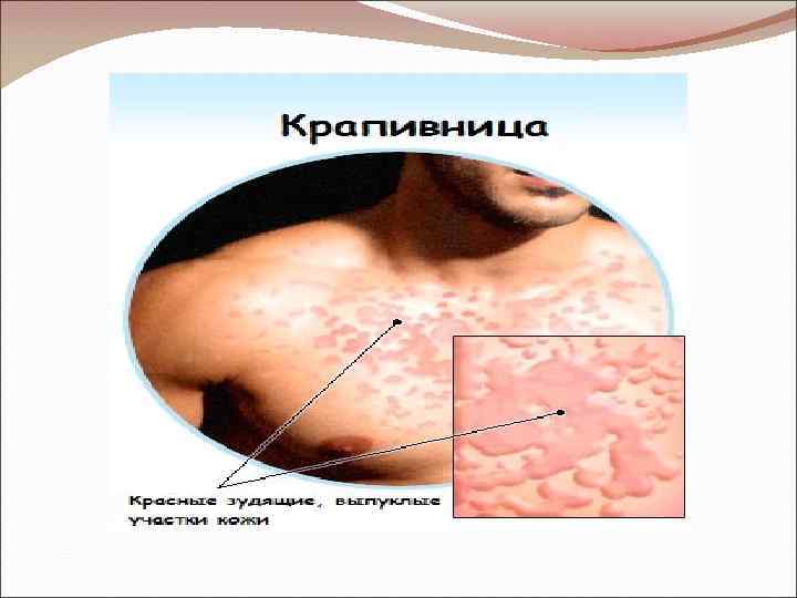 Клинические признаки: Внезапное появление одиночных или множественных волдырей и папул, выступающих над поверхностью кожи, с гипермией и четкими границами на кожных покровах лица, рук, туловища, ног Размеры кожных элементов — от 1 -2 мм до 1520 см и даже больше; иногда элементы сливного характера Сильный зуд Высыпания могут сочетаться с отеком Может развиться генерализованная анафилактическая реакция, потенциально фатальная Отсутствие пигментации, рубцов после исчезновения сыпи и пятен