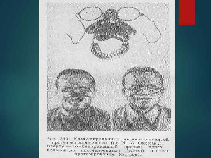 Материалы. До 40 -х годов ХХ века протезы лица изготовляли из металла, фарфора, слоновой кости, целлулоида и каучука, окрашивая их верхнюю поверхность масляными красками. Делались попытки изготовления мягких эластичных протезов из желатина. Наиболее удобным материалом для лицевых протезов являются пластмасса. Ее преимущество в доступности, малой относительной плотности, возможности окрашивания под цвет кожи лица. Протезы легко подвергаются гигиенической обработке.