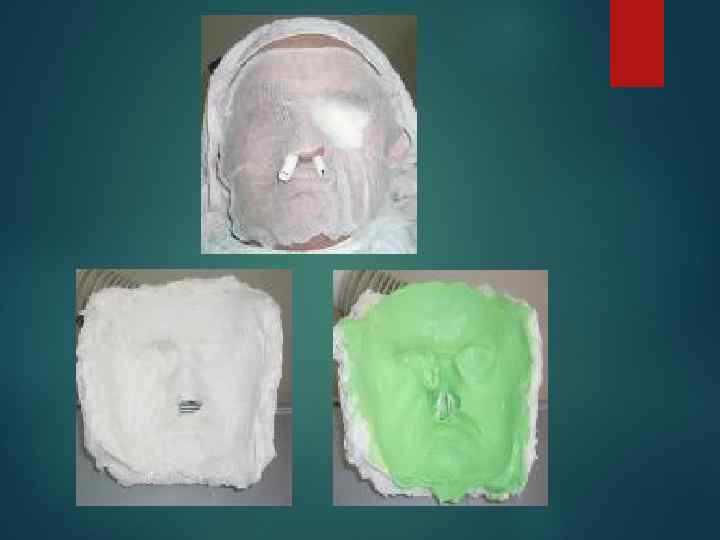 Методика изготовления маски лица. С этой целью больного укладывают в горизонтальном положении, вставляют резиновые трубки в носовые отверстия для дыхания во время закрытия гипсом лица, волосистые части его смазывают вазелином и закрывают полотенцем голову и шею. Дефект лица покрывают марлевым салфетками. Затем наносят на лицо слой жидкого гипса толщиной 1 -1, 5 см в следующей последовательности: лоб, глаза, нос, щеки, нижняя часть лица. Когда гипс затвердеет, оттиск с лица осторожно снимают , опускают его в воду на 15 минут и отливают маску лица.
