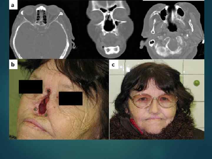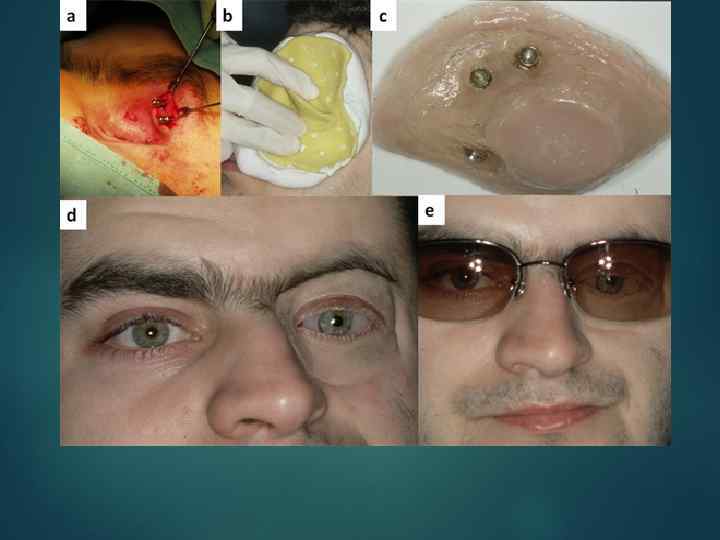 Глазной протез: a) КT перед началом лечения; b) глазница; c) установка имплантатов.
