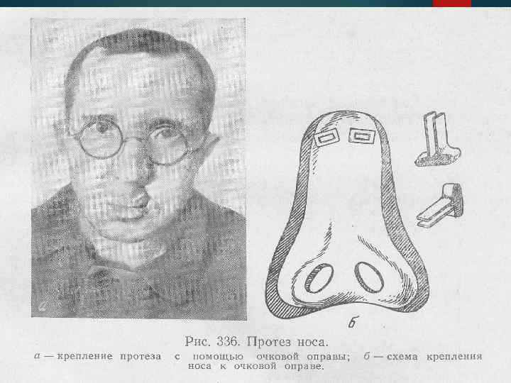 Протез носа: Замещение дефекта носа протетическим путем проводится при обширном его повреждении. Протез носа на лице фиксируют очковой оправой a) восковой оттиск; b) полимеризация; c) окраска; d) установка магнитов.
