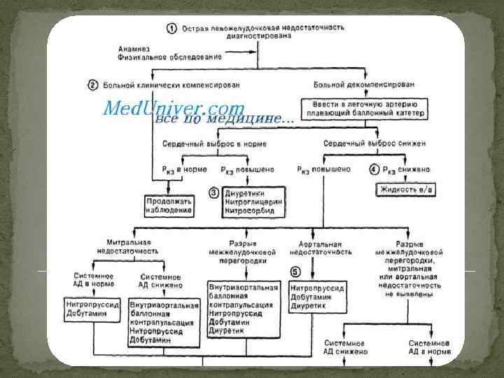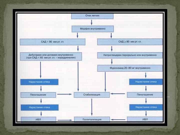 Сердечная астма и отек легких требуют немедленной интенсивной терапии. Задачи лечения: нормализация эмоционального статуса, устранение гиперкатехоламинемии и гипервентиляции; уменьшение преднагрузки; разгрузка малого круга кровообращения; снижение давления в малом и большом кругах кровообращения; оксигенотерапия; повышение сократительной способности миокарда; уменьшение альвеолярно-капиллярной проницаемости; разрушение пены (использование пеногасителей). Подход к лечению должен быть дифференцированным в зависимости от причин острой левожелудочковой недостаточности. Прежде всего необходимо удобно усадить больную, опустив ее ноги с кровати и обеспечив опору для спины и рук, а также аспирировать мокроту из верхних дыхательных путей. Все лекарственные средства вводят внутривенно. .