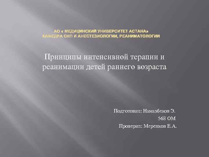 АО « МЕДИЦИНСКИЙ УНИВЕРСИТЕТ АСТАНА» КАФЕДРА СНП И АНЕСТЕЗИОЛОГИИ, РЕАНИМАТОЛОГИИ Принципы интенсивной терапии и реанимации детей раннего возраста Подготовил: Намазбеков Э. 568 ОМ Проверил: Меренков Е. А.