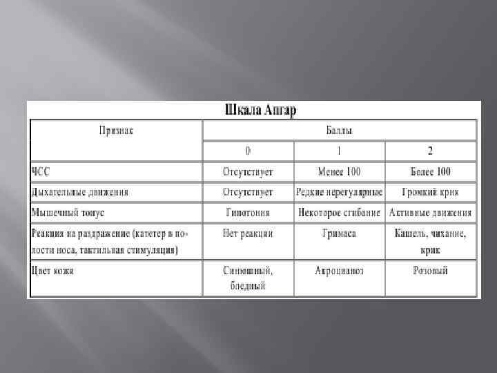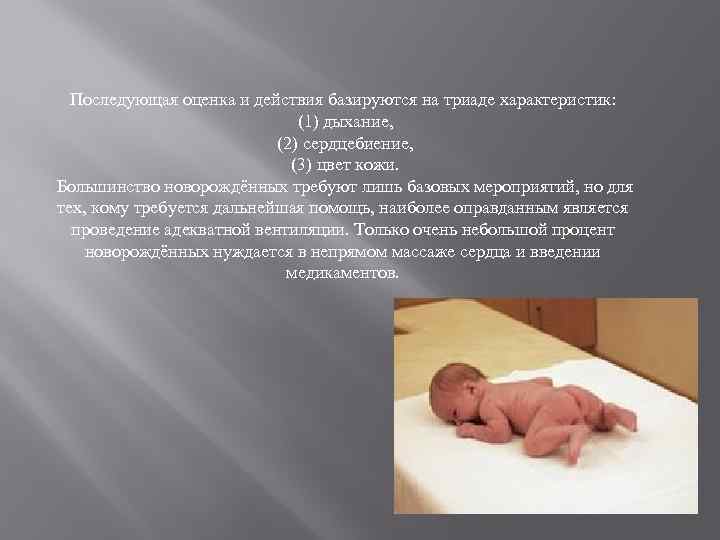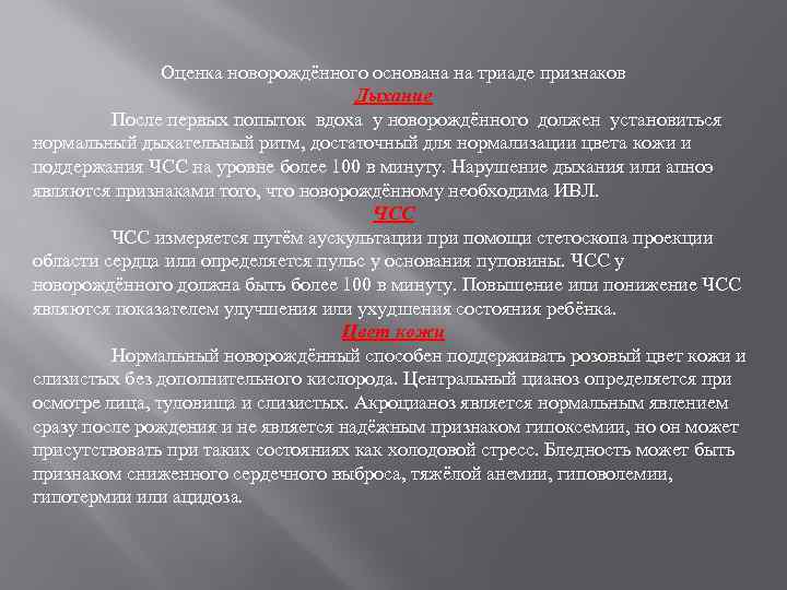 Оценка новорождённого основана на триаде признаков Дыхание После первых попыток вдоха у новорождённого должен установиться нормальный дыхательный ритм, достаточный для нормализации цвета кожи и поддержания ЧСС на уровне более 100 в минуту. Нарушение дыхания или апноэ являются признаками того, что новорождённому необходима ИВЛ. ЧСС измеряется путём аускультации при помощи стетоскопа проекции области сердца или определяется пульс у основания пуповины. ЧСС у новорождённого должна быть более 100 в минуту. Повышение или понижение ЧСС являются показателем улучшения или ухудшения состояния ребёнка. Цвет кожи Нормальный новорождённый способен поддерживать розовый цвет кожи и слизистых без дополнительного кислорода. Центральный цианоз определяется при осмотре лица, туловища и слизистых. Акроцианоз является нормальным явлением сразу после рождения и не является надёжным признаком гипоксемии, но он может присутствовать при таких состояниях как холодовой стресс. Бледность может быть признаком сниженного сердечного выброса, тяжёлой анемии, гиповолемии, гипотермии или ацидоза.