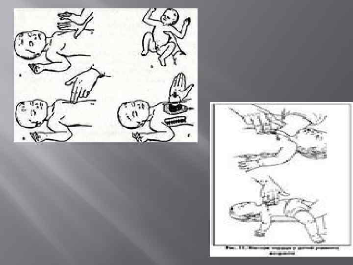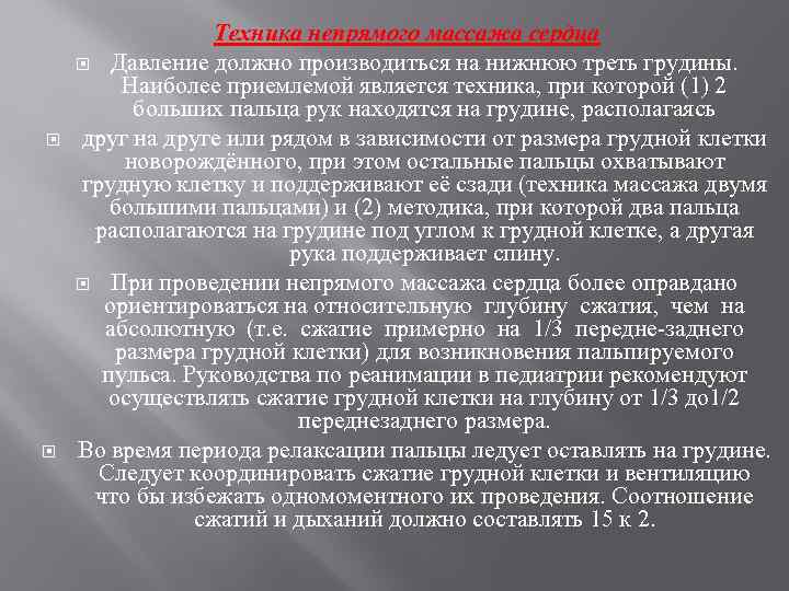 Техника непрямого массажа сердца Давление должно производиться на нижнюю треть грудины. Наиболее приемлемой является техника, при которой (1) 2 больших пальца рук находятся на грудине, располагаясь друг на друге или рядом в зависимости от размера грудной клетки новорождённого, при этом остальные пальцы охватывают грудную клетку и поддерживают её сзади (техника массажа двумя большими пальцами) и (2) методика, при которой два пальца располагаются на грудине под углом к грудной клетке, а другая рука поддерживает спину. При проведении непрямого массажа сердца более оправдано ориентироваться на относительную глубину сжатия, чем на абсолютную (т. е. сжатие примерно на 1/3 передне-заднего размера грудной клетки) для возникновения пальпируемого пульса. Руководства по реанимации в педиатрии рекомендуют осуществлять сжатие грудной клетки на глубину от 1/3 до 1/2 переднезаднего размера. Во время периода релаксации пальцы ледует оставлять на грудине. Следует координировать сжатие грудной клетки и вентиляцию что бы избежать одномоментного их проведения. Соотношение сжатий и дыханий должно составлять 15 к 2.
