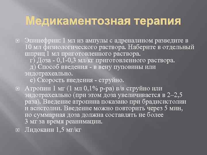 Медикаментозная терапия Эпинефрин: 1 мл из ампулы с адреналином разведите в 10 мл физиологического раствора. Наберите в отдельный шприц 1 мл приготовленного раствора. г) Доза - 0, 1 -0, 3 мл/кг приготовленного раствора. д) Способ введения - в вену пуповины или эндотрахеально. е) Скорость введения - струйно. Атропин 1 мг (1 мл 0, 1% р-ра) в/в струйно или эндотрахеально (при этом доза увеличивается в 2– 2, 5 раза). Введение атропина показано при брадисистолии и асистолии. Введение можно повторить через 5 мин, но суммарная доза должна составлять не более 3 мг за время реанимации. Лидокаин 1, 5 мг/кг