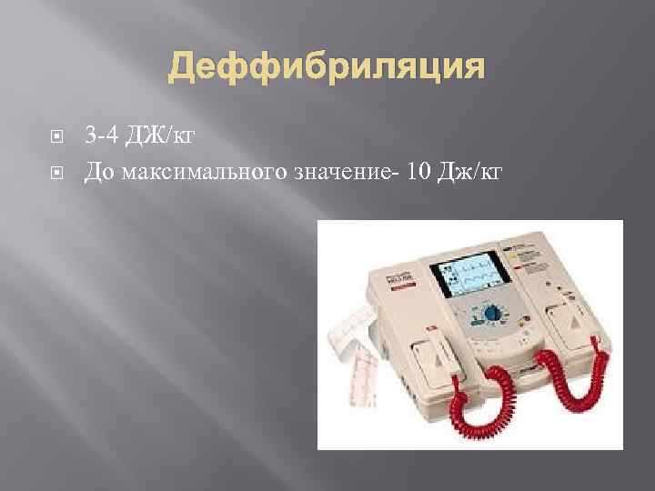 Деффибриляция 3 -4 ДЖ/кг До максимального значение- 10 Дж/кг