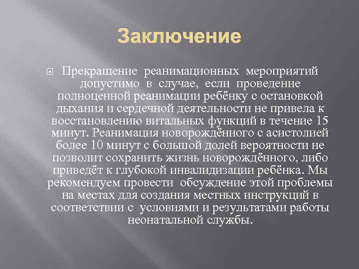 Заключение Прекращение реанимационных мероприятий допустимо в случае, если проведение полноценной реанимации ребёнку с остановкой дыхания и сердечной деятельности не привела к восстановлению витальных функций в течение 15 минут. Реанимация новорождённого с асистолией более 10 минут с большой долей вероятности не позволит сохранить жизнь новорождённого, либо приведёт к глубокой инвалидизации ребёнка. Мы рекомендуем провести обсуждение этой проблемы на местах для создания местных инструкций в соответствии с условиями и результатами работы неонатальной службы.