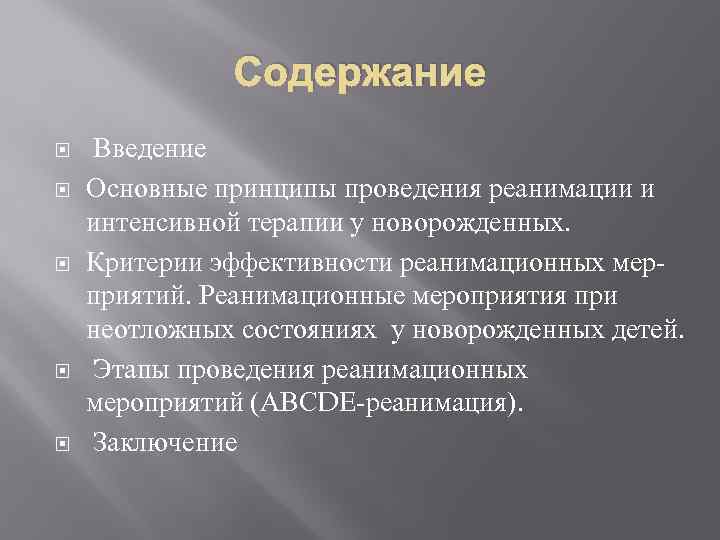 Содержание Введение Основные принципы проведения реанимации и интенсивной терапии у новорожденных. Критерии эффективности реанимационных мерприятий. Реанимационные мероприятия при неотложных состояниях у новорожденных детей. Этапы проведения реанимационных мероприятий (АВСDE-реанимация). Заключение