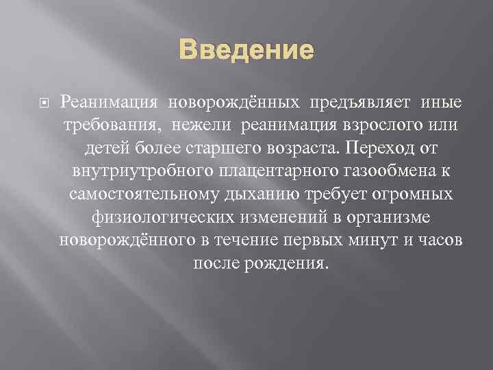 Введение Реанимация новорождённых предъявляет иные требования, нежели реанимация взрослого или детей более старшего возраста. Переход от внутриутробного плацентарного газообмена к самостоятельному дыханию требует огромных физиологических изменений в организме новорождённого в течение первых минут и часов после рождения.
