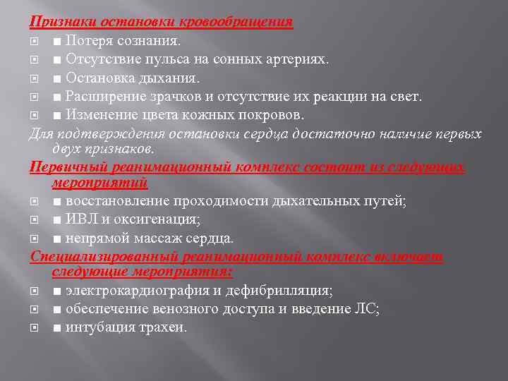Признаки остановки кровообращения ■ Потеря сознания. ■ Отсутствие пульса на сонных артериях. ■ Остановка дыхания. ■ Расширение зрачков и отсутствие их реакции на свет. ■ Изменение цвета кожных покровов. Для подтверждения остановки сердца достаточно наличие первых двух признаков. Первичный реанимационный комплекс состоит из следующих мероприятий ■ восстановление проходимости дыхательных путей; ■ ИВЛ и оксигенация; ■ непрямой массаж сердца. Специализированный реанимационный комплекс включает следующие мероприятия: ■ электрокардиография и дефибрилляция; ■ обеспечение венозного доступа и введение ЛС; ■ интубация трахеи.