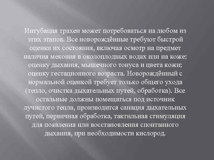 Интубация трахеи может потребоваться на любом из этих этапов. Все новорождённые требуют быстрой оценки их состояния, включая осмотр на предмет наличия мекония в околоплодных водах или на коже; оценку дыхания, мышечного тонуса и цвета кожи; оценку гестационного возраста. Новорождённый с нормальной оценкой требует только общего ухода (тепло, очистка дыхательных путей, обработка). Все остальные должны помещаться под источник лучистого тепла, производится санация дыхательных путей, первичная обработка, тактильная стимуляция для появления или восстановления спонтанного дыхания, при необходимости кислород.