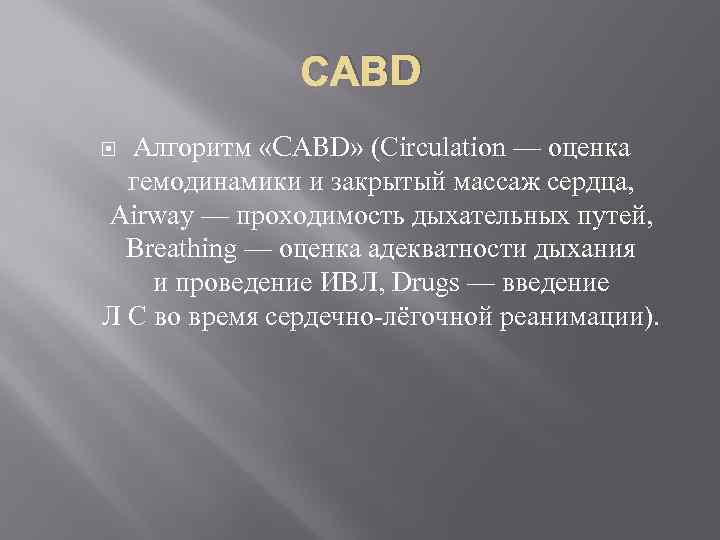 САВD Алгоритм «CABD» (Circulation — оценка гемодинамики и закрытый массаж сердца, Airway — проходимость дыхательных путей, Breathing — оценка адекватности дыхания и проведение ИВЛ, Drugs — введение Л С во время сердечно-лёгочной реанимации).