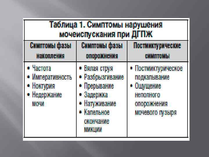 Симптомы нарушения мочеиспускания при ДГПЖ и РПЖ Обструктивные симптомы 1. Ослабление струи мочи 2. Прерывистое мочеиспускание 2. Затрудненное мочеиспускание 3. Ощущение неполного опорожнения мочевого пузыря 4. адержка мочи Ирритативные симптомы 1. Императивные (повел ительные) позывы 3. Учащенное дневное и ночное мочеиспускание 4. Невозможность удержать мочу при возникновении позыва
