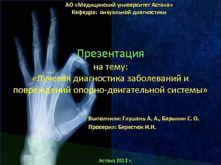 АО «Медицинский университет Астана» Кафедра: визуальной диагностики Презентация на тему: «Лучевая диагностика заболеваний и повреждений опорно-двигательной системы» Выполнили: Глушань А. А. , Барыкин С. О. Проверил: Берестюк И. Н. Астана 2012 г. Астана г.