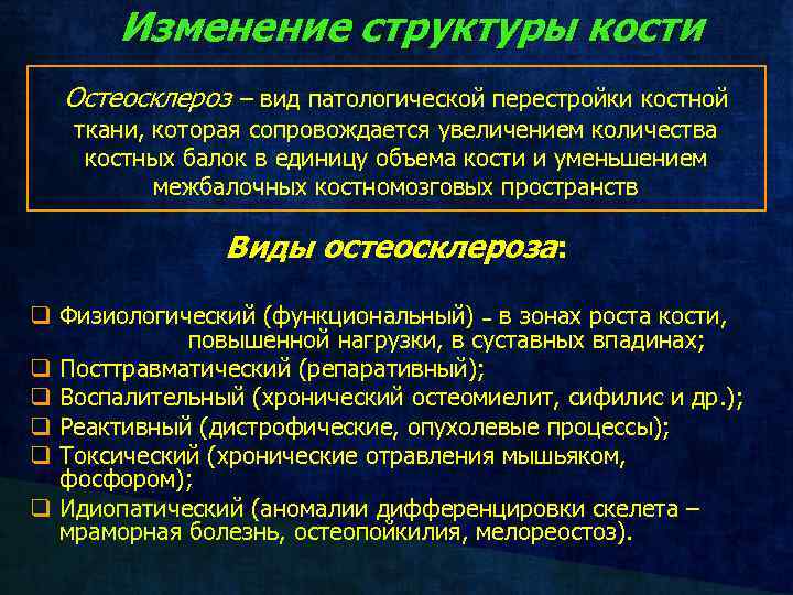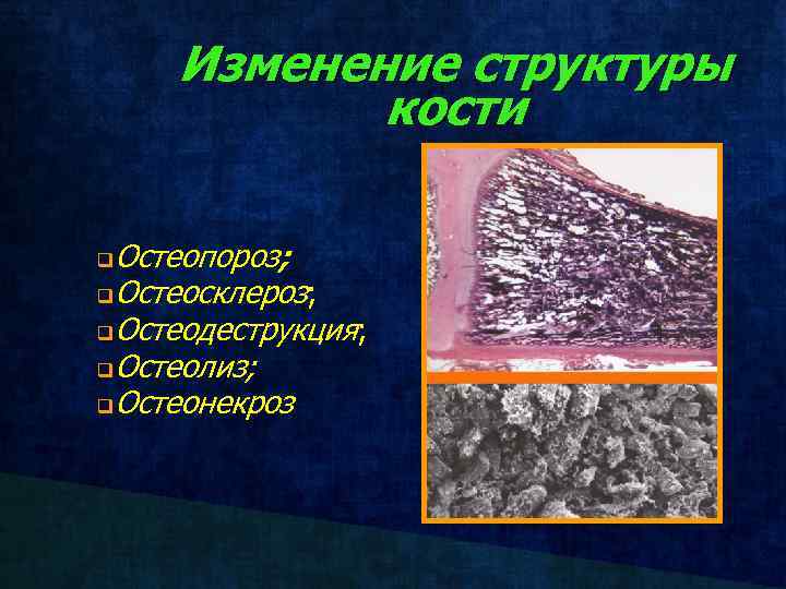 Изменение структуры кости Остеопороз; q. Остеосклероз; q. Остеодеструкция; q. Остеолиз; q. Остеонекроз q