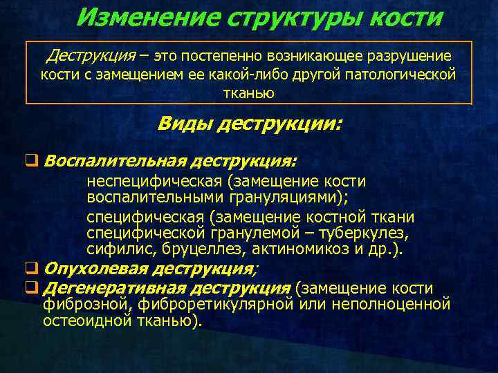 Изменение структуры кости Деструкция – это постепенно возникающее разрушение кости с замещением ее какой-либо другой патологической тканью Виды деструкции: q Воспалительная деструкция: неспецифическая (замещение кости воспалительными грануляциями); специфическая (замещение костной ткани специфической гранулемой – туберкулез, сифилис, бруцеллез, актиномикоз и др. ). q Опухолевая деструкция; q Дегенеративная деструкция (замещение кости фиброзной, фиброретикулярной или неполноценной остеоидной тканью).