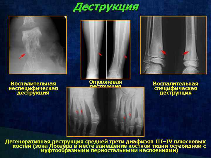 Деструкция Воспалительная неспецифическая деструкция Опухолевая деструкция Воспалительная специфическая деструкция Дегенеративная деструкция средней трети диафизов III–IV плюсневых костей (зона Лоозера в месте замещение костной ткани остеоидной с муфтообразными периостальными наслоениями)