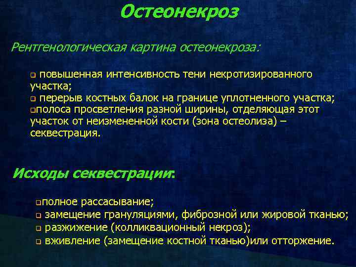 Остеонекроз Рентгенологическая картина остеонекроза: повышенная интенсивность тени некротизированного участка; q перерыв костных балок на границе уплотненного участка; qполоса просветления разной ширины, отделяющая этот участок от неизмененной кости (зона остеолиза) – секвестрация. q Исходы секвестрации: полное рассасывание; q замещение грануляциями, фиброзной или жировой тканью; q разжижение (колликвационный некроз); q вживление (замещение костной тканью)или отторжение. q