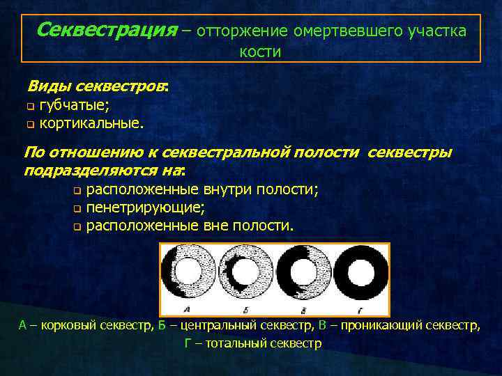 Секвестрация – отторжение омертвевшего участка кости Виды секвестров: q q губчатые; кортикальные. По отношению к секвестральной полости секвестры подразделяются на: q q q расположенные внутри полости; пенетрирующие; расположенные вне полости. А – корковый секвестр, Б – центральный секвестр, В – проникающий секвестр, Г – тотальный секвестр
