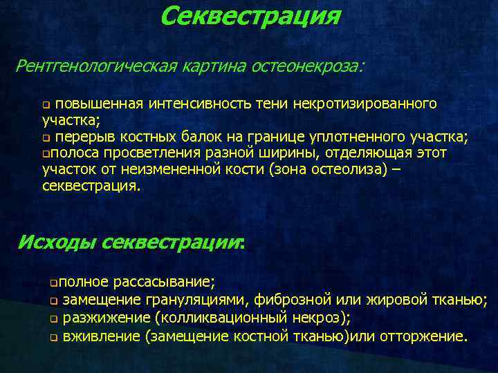 Секвестрация Рентгенологическая картина остеонекроза: повышенная интенсивность тени некротизированного участка; q перерыв костных балок на границе уплотненного участка; qполоса просветления разной ширины, отделяющая этот участок от неизмененной кости (зона остеолиза) – секвестрация. q Исходы секвестрации: полное рассасывание; q замещение грануляциями, фиброзной или жировой тканью; q разжижение (колликвационный некроз); q вживление (замещение костной тканью)или отторжение. q