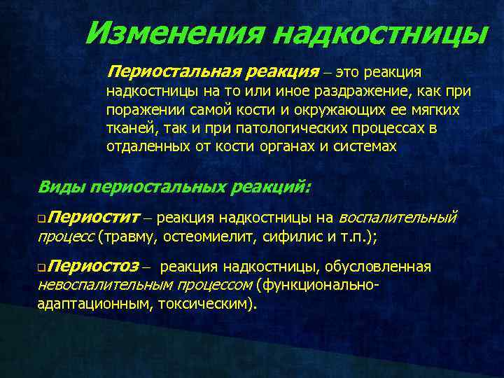 Изменения надкостницы Периостальная реакция это реакция надкостницы на то или иное раздражение, как при поражении самой кости и окружающих ее мягких тканей, так и при патологических процессах в отдаленных от кости органах и системах Виды периостальных реакций: q Периостит реакция надкостницы на воспалительный процесс (травму, остеомиелит, сифилис и т. п. ); q Периостоз реакция надкостницы, обусловленная невоспалительным процессом (функциональноадаптационным, токсическим).