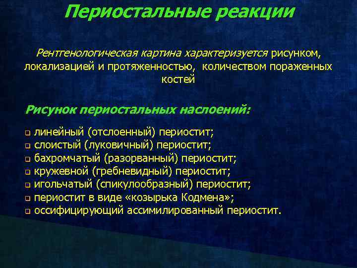 Периостальные реакции Рентгенологическая картина характеризуется рисунком, локализацией и протяженностью, количеством пораженных костей Рисунок периостальных наслоений: q q q q линейный (отслоенный) периостит; слоистый (луковичный) периостит; бахромчатый (разорванный) периостит; кружевной (гребневидный) периостит; игольчатый (спикулообразный) периостит; периостит в виде «козырька Кодмена» ; оссифицирующий ассимилированный периостит.