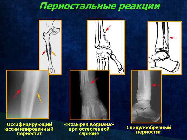Периостальные реакции Оссифицирующий ассимилированный периостит «Козырек Кодмана» при остеогенной саркоме Спикулообразный периостит