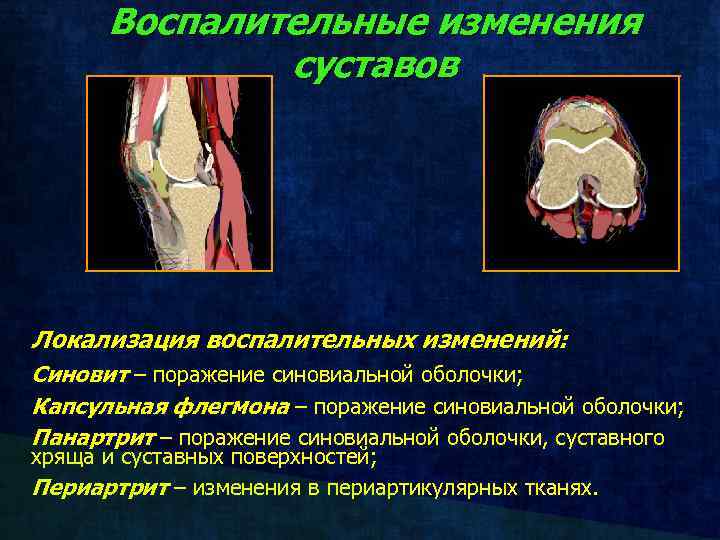 Воспалительные изменения суставов Локализация воспалительных изменений: Синовит – поражение синовиальной оболочки; Капсульная флегмона – поражение синовиальной оболочки; Панартрит – поражение синовиальной оболочки, суставного хряща и суставных поверхностей; Периартрит – изменения в периартикулярных тканях.