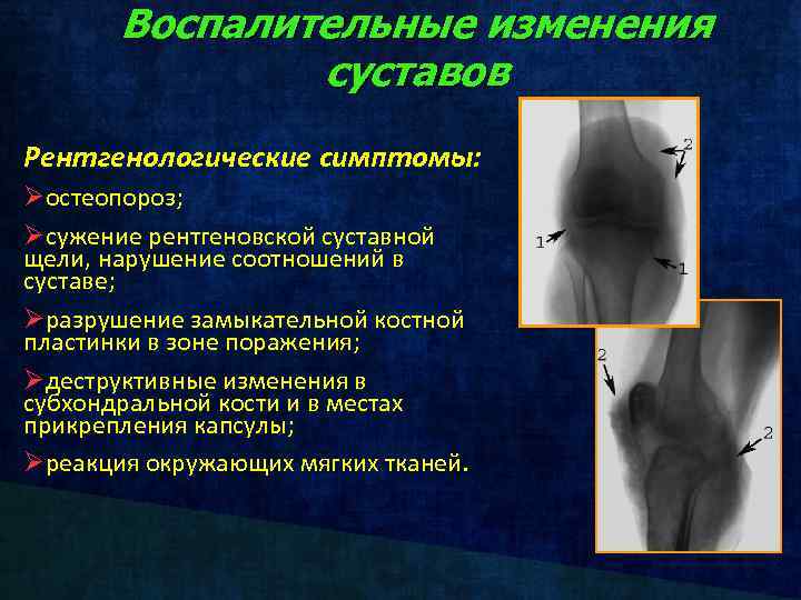 Воспалительные изменения суставов Рентгенологические симптомы: Øостеопороз; Øсужение рентгеновской суставной щели, нарушение соотношений в суставе; Øразрушение замыкательной костной пластинки в зоне поражения; Øдеструктивные изменения в субхондральной кости и в местах прикрепления капсулы; Øреакция окружающих мягких тканей.