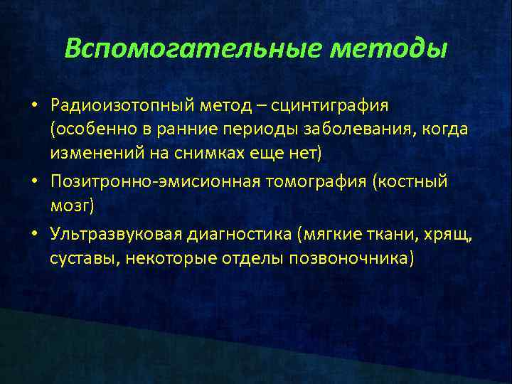 Вспомогательные методы • Радиоизотопный метод – сцинтиграфия (особенно в ранние периоды заболевания, когда изменений на снимках еще нет) • Позитронно-эмисионная томография (костный мозг) • Ультразвуковая диагностика (мягкие ткани, хрящ, суставы, некоторые отделы позвоночника)