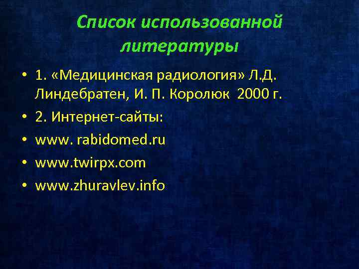 Список использованной литературы • 1. «Медицинская радиология» Л. Д. Линдебратен, И. П. Королюк 2000 г. • 2. Интернет-сайты: • www. rabidomed. ru • www. twirpx. cоm • www. zhuravlev. info